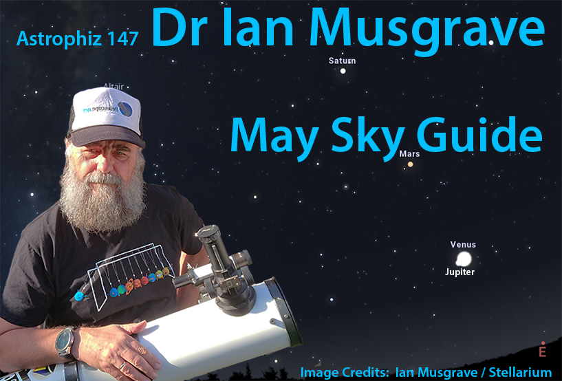 Ian gives us the dates of the moon phases and the best times to observe planets, clusters and deep sky objects. A special treat that is worth getting up early for is the Venus-Jupiter conjunction on May 1st, and hear about further opportunities during May to observe planetary lineups in the morning skies as well as seeing a meteor shower provide by debris from Halley’s Comet.